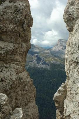 Urmatoarea dimineata ne-am despartit de prietenii nostri si am plecat din nou spre Cortina. Nae era nerabdator sa faca un traseu de via ferata mai tare.Din nou la Shopping.. de data asta in Cortina iar apoi ne decidem sa urcam La Cinque Torri, o zona pe la 2100 metri, cu multe turnulete (de fapt sunt mai multi torri, dupa cum a zis Tufis) si trasee de catarat pe ele. Unul dintre turnuri cu o lungime de vreo 40 m s-a prabusit acum vreo 2 ani cu tot cu trasee .(au mai batut astia un traseu chiar pe baza.) Mi-a placut mult zona era foarte primitoare. Ne-am catarat o zi intreaga, pe multe, multe trasee, deoarece vremea nu ne-a permis altceva. Seara ne-am "jucat" cu marmotele si am baut vin la cabana. (foarte bun vinul)De dimineata, eu si cu Nae, am plecat spre traseul de via ferata , mult visat de Nae :) , pe Vf. Tofana di Mezzo, la 3225 m (parca) un traseu cotat 5c, adica cel ma tare :D .Vreme bunicica. Am crezut ca nu vom intani prea multi oameni pe traseu dar n-a fost chiar asa. Am tot depasit echipe pe traseu. Era fain ca nu erau scari, doar cablu si puteai sa te cateri mai mult. Privelistea era superba, sub noi cateva sute de metri la inceput apoi 1000 . Pe drum ne-a invaluit ceata si a inceput chiar si sa ninga. La un moment dat, dupa un pasaj mai dificil ne-am intalnit cu un grup mai mare de nemti, am impresia, care ne-a lasat sa trecem... si dupa colt ..haul. Era o traversare pe cablu, cu picioarele pe o muchie de 5 cm si sub vreo 1000 de metri :D Foarte interesant.In cele din urma am ajuns si pe varf, am hotarat sa ne intoarcem pe un alt traseu , dar din cauza cetii si a proastei marcari nu am reusit sa-l gasim asa ca am coborat o portiune cu telecabina iar apoi am mai facut un traseu de via ferata pana la masina. Seara ne-am intanit cu baietii la Cinque Torri, erau putin cam infrigurati, nu reusisera sa catere foarte mult, asa ca ne-am incalzit la un pahar de vin la cabana.Pentru ca vremea nu ne-a permis sa mai stam la altitudine, am mai coborat cateva sute de metri la cateva faleze de catarat dar si acestea erau ude din cauza ploii prin urmare ne-am tot plimbat cu masina pe serpentine,inspre nord, incet,incet..spre Romania.Seara ne-am oprit intr-o padure sa inoptam. Eu cu Nae ne-am pus cortul dar Tufis si Fane au ramas sa doarma afara. Ghinion, bineintele ca a venit ploaia. Fane s-a aciuat sub un pod unde a construit si un mic baraj ca sa nu il inunde raurile care se formasera din cauza ploii.