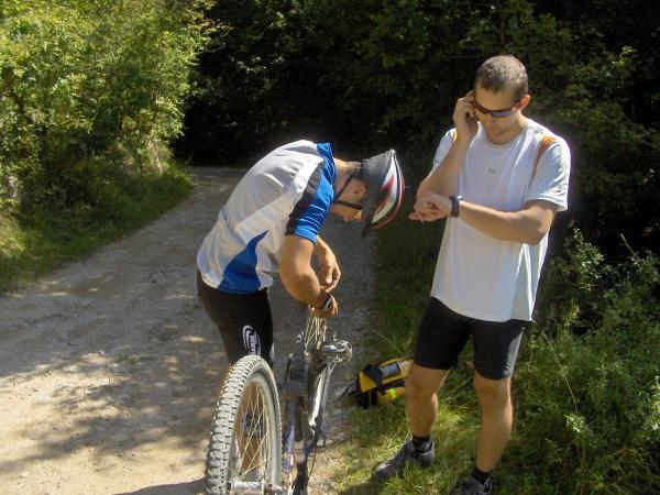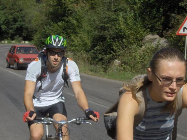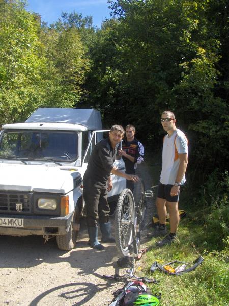 Omleta de la pizzerie a fost printre cele mai bune si clar vom manca acolo si maine dimineata. La 11:30 ne pornim ... pe sosea la un moment dat dam peste un punct de control. Responsabilul sare sa vada care-i treaba , nu veneam din directia care trebuie ... si abia apoi isi da seama ca nu avem numere de concurs pe bicileta si deci nu suntem in concurs. Oricum suntem primii :) , si vom ramane primii inca 3 puncte de control de aici incolo. Abia dupa Iabalcea incep sa ne depaseasca concurentii si dupa ritmul pe care il prezinta ne bucuram inca o data ca nu suntem inscrisi in concurs. La scurt timp dupa "depasire" noi ne abatem de la traseul de concurs si coboram in dreapta catre cantonul de la pestera Comarnic. Reusesc sa fac o pana pe coborarea pe bolovanis si ne punem sa reparam, dar surpriza .. nu am cheie sa dau jos roata, bicicleta mea e singura care mai are inca suruburi normale la roti, si binenteles eu nu am cheia necesara. Dupa ce oprim o masina in cautarea unei chei dar nici ei nu au, nici macar un patent , ne decidem sa reparam camera direct pe bicicleta, fara sa mai dam jos roata. Dupa 10 minute si cateva pompe suntem iarasi buni de drum. La Comarnic stam cam 10 minute, cat sa intrebam de drum, si ne dam seama ca e mai bine sa ne intoarcem si sa intram din nou pe traseul de concurs. Asta si facem si la 17:30,dupa o coborare destul de lunga, in timpul careia il intalnim si pe Negru, inscris la 80, ajungem inapoi in centrul Resitei, dupa 45km parcursi. Ne asteapta Ioana, si mai intai si mai intai luam ceva de mancare ca sa ne linistim foamea. Apoi asistam la concursul de trial si ceva mai tarziu la premiere. Trialistii si DownHill-erii din Tm , prieteni buni cu noi sunt si ei pe acolo, si ne dam intalnire seara la concertul Rock organizat de baietii din Resita. Pentru ca mancasem deja mai devreme , ne pornim spre corturi, ne schimbam de hainele cu care am pedalat toata ziua si ne prezentam la concert. E la 100m de camping in cladirea in care ne lasasem bike-urile cu o noapte inainte si unde le vom lasa si in noaptea asta.