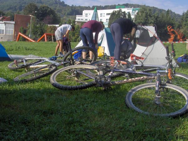Vineri pe la 19:30 reusim sa plecam din TM, 3 oameni si 4 bike-uri. Ajungem la Resitza fix la inceperea primului eveniment , "Night City Sprint" . Putini participanti la acest mic concurs introductiv pt. ziua de sambata care urmeaza sa fie plina de competii mult mai serioase. La sosirea din centru ne interesam la organizatori de locul unde este amplasat campingul temporar pentru acest concurs. Aflam ceva de fosta gradina de vara si incepem cautarile. Ne-am invartit cam jumate de ora prin Resita si nimica. Pana la urma dupa indicatii de la diferiti localnici gasim ceea ce cautam si 3Metri isi da seama ca el stia de locul, dar il stia de parcul de langa hotelul partidului. Oricum, montam corturile si punem bike-urile in siguranta intr-o cladire din apropiere , pusa la dispozitie de organizatori pentru accesul la baie. Foamea ne trage la o pizzerie din Resita si vine si Felix cu noi, un verisor, pe care l-am intalnit acolo, si care fiind pasionat de crossuri pe bike nu putea sa lipseasca.