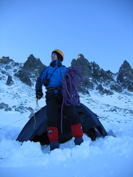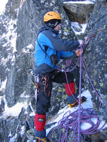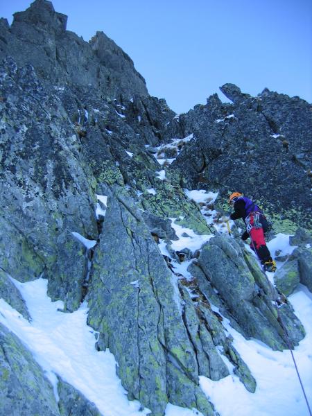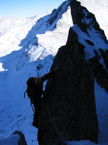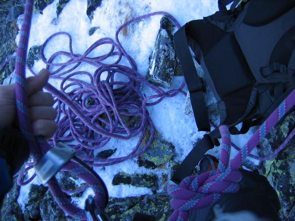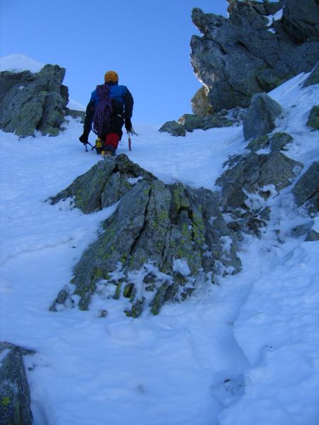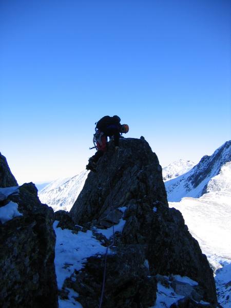 Dimineata! :) Cer SUPERB!!! priveliste de nedescris si Coltii....extraordinari! Nu credeam ca este chiar asa mult potential de trasee "adevarate", de perete, aici. Asa ca mancam, facem un ceai, ne luam ceva mancare la noi, ne echipam si urcam rapid pana sub muchie. Intram in traseu pe la ora 9:40. O catarare superba pe linia matematica a crestei, intrerupta de mici pereti cu fisuri si hornuri. Primele lungimi merg destul de repede. Gasim si ceva pitoane, mai punem cate o nuca, cate un friend...Totul merge f bine si ne simtim foarte bine. Pe la lungimea a patra dam de un perete vertical care se termina cu o mica surplomba. Pentru ca pitoanele existau dar nu imi inspirau deloc incredere si pentru ca catararea era f frumoasa am mers tot timpul la liber, fara sa tragem de vre-un cui. Insa gasindu-ma in surplomba, fara prize la coltari, fara sa pot vedea deasupra si fara sa vreau in ruptul capului sa trag de cuiele alea (ca imi pareau atat de proaste..) am tras de mine pana la limita si la urma am fost nevoit sa ma odihnesc intr-unul.. A trebuit sa si regrupez imediat dupa surplomba, intr-un perete vertical, unde am batut inca 2 pitoane pentru ca coarda venea foarte greu. A venit si Radu, a regrupat mai jos si am pornit mai departe pana in urmatoarea regrupare. Acolo am stat putin, am mancat si baut cate ceva ca sa ne refacem puterile insa eu ma simteam epuizat dupa ultima lungime. Asa ca Radu a mers cap urmatoarea lungime si apoi inca jumatate de lungime pana sub un jandarm care se urca pe un perete vertical de vre-o 25 m. Acolo aceleasi pitoane proaste, eu foarte obosit, destul de tarziu si posibilitatea de a ne retrage destul de usor ne-a facut sa ne hotaram sa renuntam. In schimb am urcat pana in creasta pe un valcel din stanga Coltilor, am stat putin la soare si apoi am coborat inapoi la cort.