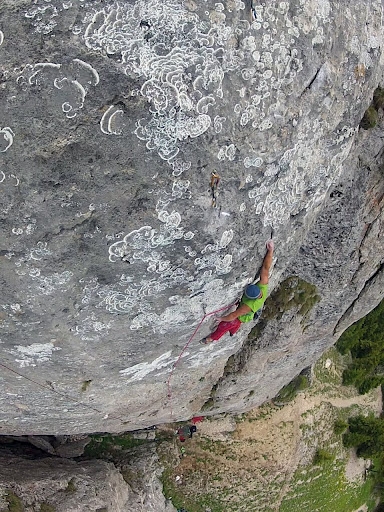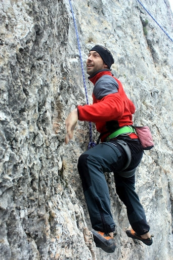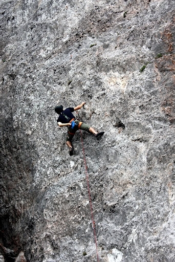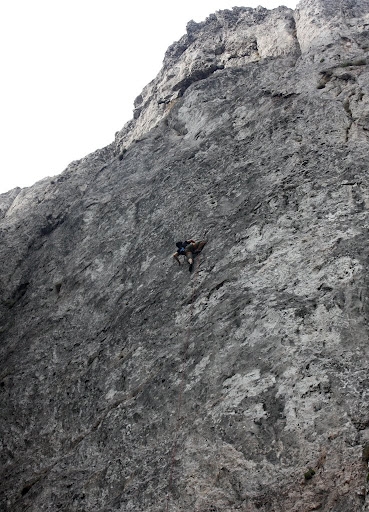 A doua zi vremea pare sa fie superba, un cer albastru nesperat, vantul a disparut se anuntau conditii excelente. Dilema e pe ce sa ma dau,o varianta ar fi "Legend", un proiect lung, murdarel si dificil, sau "Guardian Angel" un traseu recomandat de Cipri, frumos, lung, tehnic facut anul trecut la concurs, cotat la 7c+ si aparent pe mana mea. Din respect pt munca depusa de Andrei Nan, care a amenajat singur toate traseele, ma hotarasc sa ma dau pe proiectul din concurs. Il curat, fac planul si ii dau un sut.Merg destul de bine, trec de primul pas dar cad un pic mai sus, dupa vreo 25m. N-am ajuns sa asigur o bucla si fiind la limita nu mi-a venit sa merg "a muerte". Mai repet odata miscarile, prelungesc bucla, mai dau cu peria si ma pregatesc pt ultima incercare.
