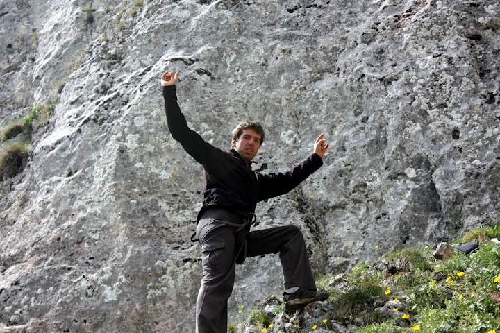 Intre timp ceilalti au mai dat o tura pe Hasmasu Mare si incet incep sa coboare la masini.Presat de timp, nu-mi permit sa astept sa-mi revin complet dupa ultima incercare si ma hotarasc sa dau un ultim sut. Trec de prima parte, probabil cea mai tare, dar fiind la inceput merge... urmeaza 25 de metri de power endurance, miscari lungi, de echilibru, tehnice ... un deliciu. Trec de gaurile scurse din primul pas, trec si de locul unde am picat la prima incercare si ajung la ultima ridicare pe picior, care dadea in ranga salvatoare. La mana stanga nimic nimic, la dreapta o inversa mica la nivelul tibiei, atat. Am parcurs 30 de metri ,e ultima miscare si trebuie doar sa ma ridic pe picior, nimic mai mult, dar pur si simplu nu pot si nu am unde sa revin, nu pot sa scutur mana dreapta si nici piciorul stang. Intind mana stanga, imi lipsesc 5cm, revin, mai o tentativa disperata de ridicare pe piciorul amortit si-am zburat ...Urlu violent, dar ma descarc instantaneu. Stau un minut, ma pun din nou pe miscare, fac pasul si in 2 minute sunt in top. Nu am reusit sa-l leg, dar n-a contat aproape deloc. Am savurat frumusetea miscarilor, feeling-ul pe care l-am avut catarand un 8a intr-un peisaj alpin. Efortul depus a fost considerabil, asa o lupta pana la epuizare totala n-am mai trait de mult.Chiar daca nu am legat "Legend", traseul "Pleasure Delayer(7c+)" din a 2-a incercare m-a pus pe primul loc. Sunt constient ca situatia ar fi fost toatal diferita daca vremea nu i-ar fi impiedicat pe ceilalti cataratori puternici sa vina, dar asta a fost. A urmat o premiere in graba si o coborare chinuitoare pana la masina.
