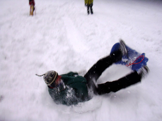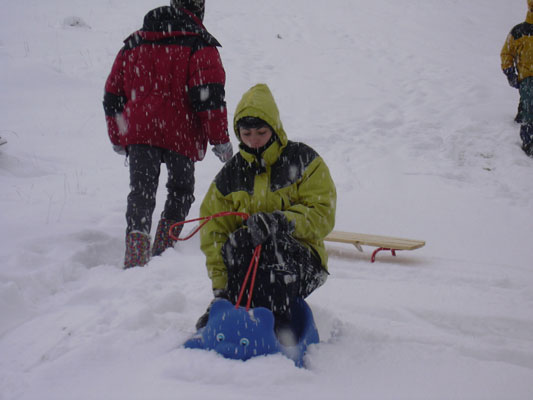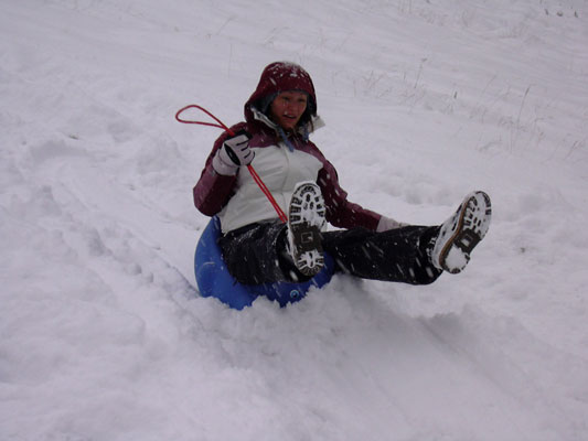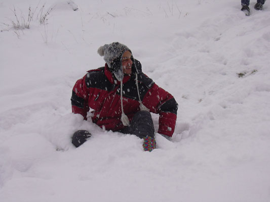 Duminica ca sa nu plecam prea repede acasa .. afara ningea in continuare, am incercat sa ne dam cu sania pe partia de schi. Nu prea mergea din aceeasi pricina, nu era strat de baza, si mai mult aram, desi zapada avea deja cel putin 30 cm. Am incercat, am dat tumbe spectaculoase, am facut poze si ... pe la 14 am hotarat sa plecam spre Timisoara. La coborarea din Rausor am mai avut ceva probleme cu franatul pentru ca drumul era un ghetus total, dar am evitat cu maestrie zborul in rapa. O hotarare ad-hoc ne-a facut sa vizitam manastirea Colt si apoi restaurantul cu clatite bune din Clopotiva. Acolo am stat aproape 2 ore pana am primit toata comanda, dar a meritat ;). Cu burta plina am ajuns la 21 in TM.