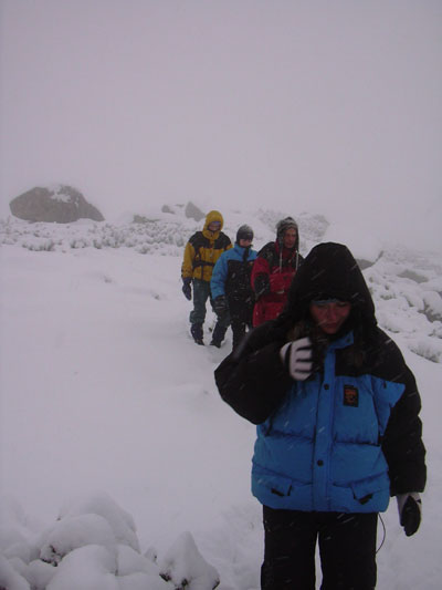 Dupa ce seara nu am mai gasit birtul deschis ca sa cumparam niste rom de pus in ceai ne culcam si lasam la voia intamplarii ora de trezire pt. a doua zi. Ne trezim pe la 10 , facem o omleta buna :D si ne echipam ca sa o luam incet spre lacul Stevia si daca ne permite timpul si pe vf. Retezat. Nici nu iesim bine din cabana ca ne intampina doi catei , Ringo si Rita, care au doar 7 luni si sunt tare jucausi. Vin cu noi si stapanul vine dupa ei sa vada cu cine au plecat cateii la deal. Stapanul, Adi, e paznicul statiunii si se cunoaste cu Lars, asa ca le "da voie" cateilor sa vina cu noi, dar in acelasi timp le promite ca "s-au lins pe bot de Chappy" pentru ca nu l-au ascultat cand i-a strigat. Afara ninge intruna de vineri si stratul a crescut undeva spre 15 - 20 cm. Fiind prima zapada , ne cam chinuim pe poteca, fiecare pas ajunge prin pulver direct pe pietre, radacini, etc. si stabilitatea e tot timpul pusa la incercare. E cea mai proasta zapada pe care se poate merge ...