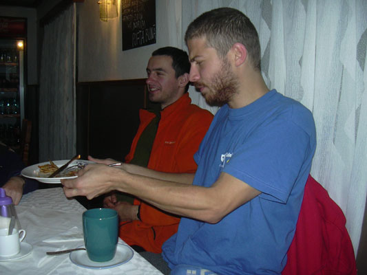Seara la cabana ne punem pe gatit si apoi avem plan sa mergem la birt sa bem o bere. Nici nu terminam bine de mancat ca mai vin doi musafiri, baiatul si sotul uneia dintre doamne si constat ca il cunosc destul de bine, Cosmin Haiduc, stomatolog, schior si pasionat de munte. Asa ca avem inca doi amatori de bere. Ne incalzim cu o tuica la cabana, adusa de ei, si pornim spre bar. La bar am stat cred ca 3 ore povestind despre una alta cu Cosmin, Lars, Norbi si Margea, si am intrat in ceva dispute verbale cu Dan Burca si Adi paznicu'. Cu primul pe tema PN Retezat si a salvamontului din zona, pe tema accesului, camparii, amenajarii de trasee si am terminat discutia in termeni amiabili, ceea ce mi s-a parut foarte important. Cu Adi am avut discutii pe tema Skandenberg-ului, "sport" la care l-am batut lejer , dar m-a pus sa recunosc ca nu a fost usor ... ma rog, nici o problema, dar mi-a explicat ca daca practici culturismul devii tare in "sportul" asta. Si aici am inceput cu contradictiile, i-am spus ca nu masa conteaza, el ca nu, masa e foarte importanta ... si avea si o explicatie :D ... pai in fizica zice asa masa*acceleratia=forta. Era sa pic de pe scaun la explicatia asta ... dar pana la urma am reusit sa-l conving ca formula aia nu are aplicabilitate prea mare la Skandenberg. Am vazut la TV si golurile lui Poli de la galati si pe la 1 am plecat bucurosi la cabana.