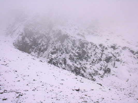 Facem o ora jumate pana la Condor , si le arat micutul refugiu si celorlalti care nu il stiau (in afara de Diana). Ii spun lui Margelatu' ca ar fi baza ideala pentru a deschide niste trasee iarna in peretii de sub Retezat din caldare. De fapt asta era al doilea scop al iesirii, sa vedem peretii de acolo si sa vedem daca ar merge ceva trasee acolo. Ne mai ia cam 45 de minute pana la lac si intre timp avem strat de baza sub zapada proaspata, dar si vremea s-a stricat radical, adica viscoleste. Nu stam mult, facem ceva poze la peretii de care vorbeam, si o dam la vale ca sa ajungem la caban pe lumina.