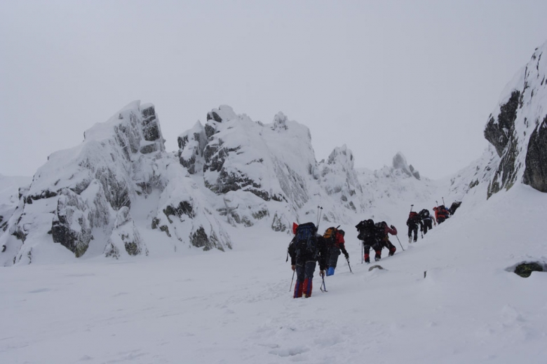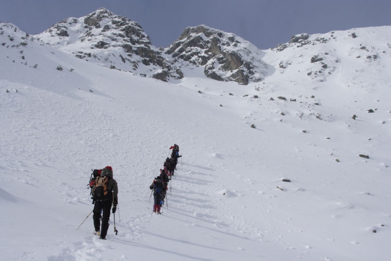 Fiind un curs de introducere in ture de iarna si nu de alpinism, am pus accentul pe trekking in conditii de iarna si pe rezolvarea problemelor ce pot aparea intr-o astfel de tura: evitarea corniselor si taierii pantelor, orientare in teren, retrageri peste saritori, parcurgerea asigurata a unor portiuni de creasta expuse, parcugerea unor pasaje cu gheata.