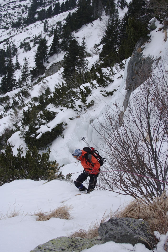 Mai departe am ales sa facem o tura pe creasta Stanisoara, in care am urcat din apropiere de L. Pietrele si am coborat pe langa cascada de gheata. La coborare am montat un rapel pe langa cascada, unde participantii au invatat sa coboare cu semicabestanul si am discutat un pic despre amaraje.