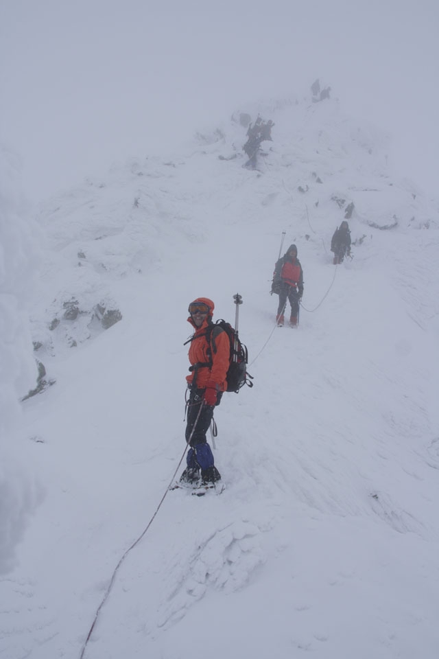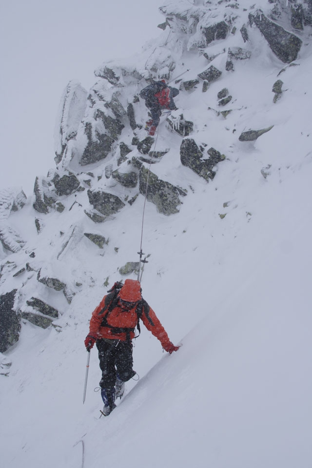 Am tinut exact linia crestei, luand de-a dreptul stancile cu chiciura intre-picioare, pt. a exersa parcurgerea asigurata in coarda, a zonelor expuse, si plasarea asigurarilor (anneau-uri) dupa stanci. Am format 2 echipe: eu cu o coarda si Horia cu cealalta (defapt semicorzi, de alpnism, nu altfel :-)) cu cate 4-5 cursanti fiecare.