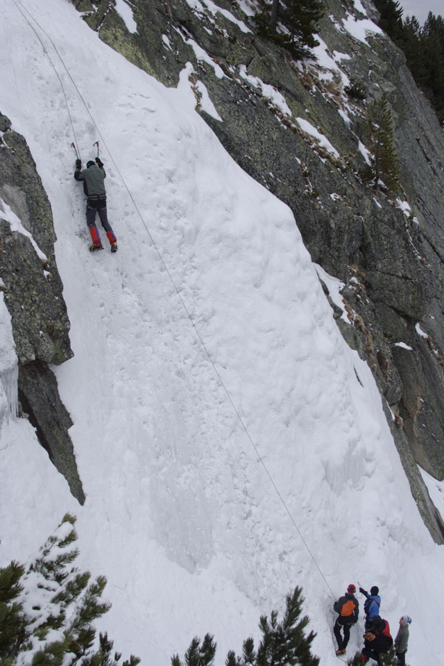 Ne-am trezit cu multa lene (cel putin cei din jurul meu), data fiind tura din ziua anterioara, dar vreamea buna cu cer senin si din nou fara vant ne-a motivat. Dupa micul dejun – care pt. mine a fost mare – ne-am adunat in fata cabanei pt. o scurta sesiune „teoretica” despre echipamentul de iarna. Apoi am urcat la cascada unde am amenajat 2 ateliere: rapel si catarare pe gheata. La rapel am „reluat” semicabestanul, de data asta cursantii si-au pus singuri nodul in carabiniera. La catarare, nefiind un curs de alpinism sau de catarare pe cascade de gheata, am ales o fata cazuta (60-75°) cu gheata mai moale, pe care am montat o mansa.