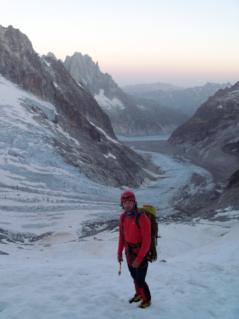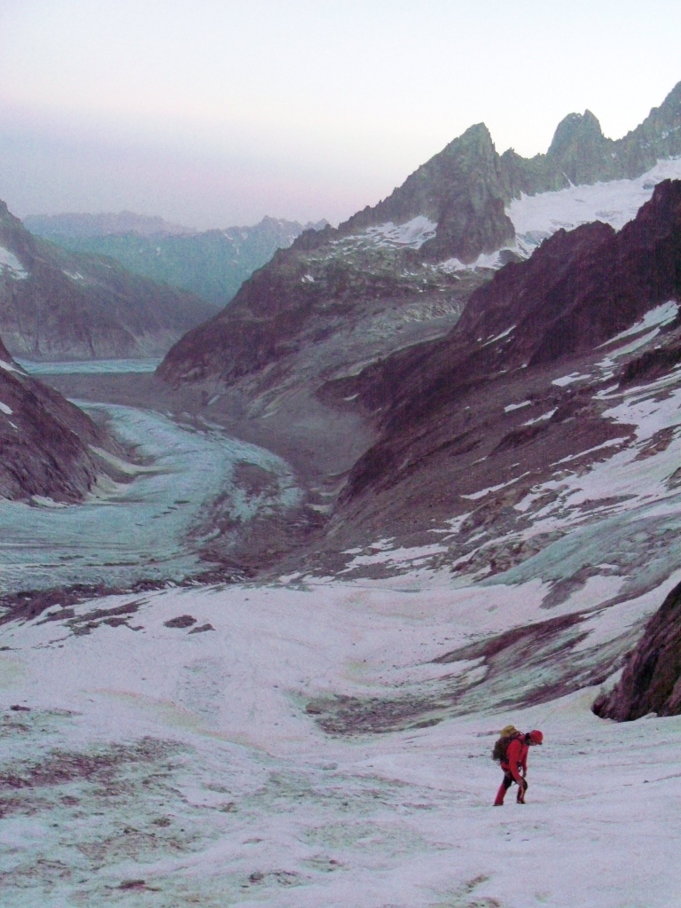 Pe Mer de Glace si pe ghetarul Leschaux inaintam destul de rapid si pe la 6 seara ajungem la refugiul Leschaux. Mai sunt doua echipe, niste francezi care vor intra in Anouk tot in Petites Jorasses si doi cehi care planuiesc sa intre in Colton MacIntyre in Grandes Jorasses.
