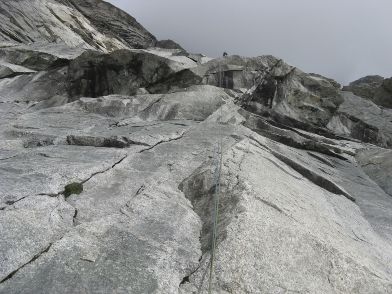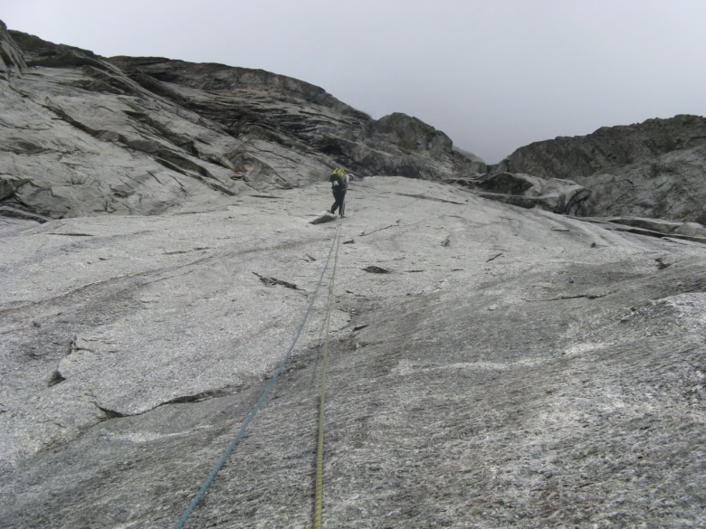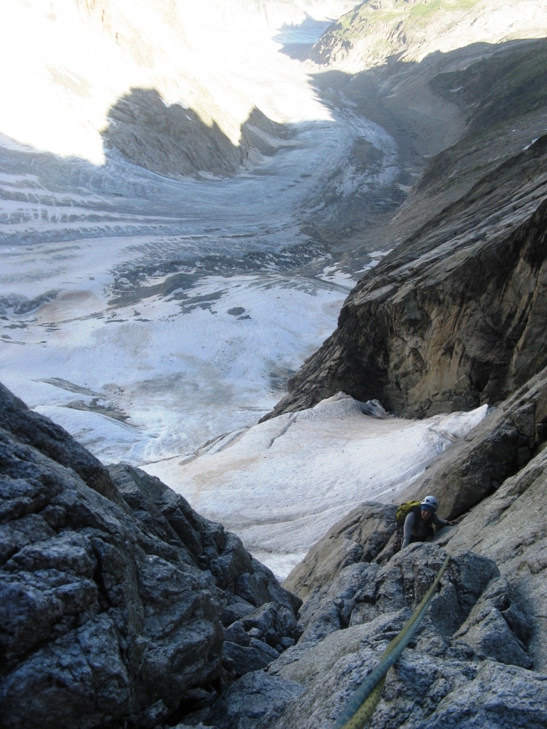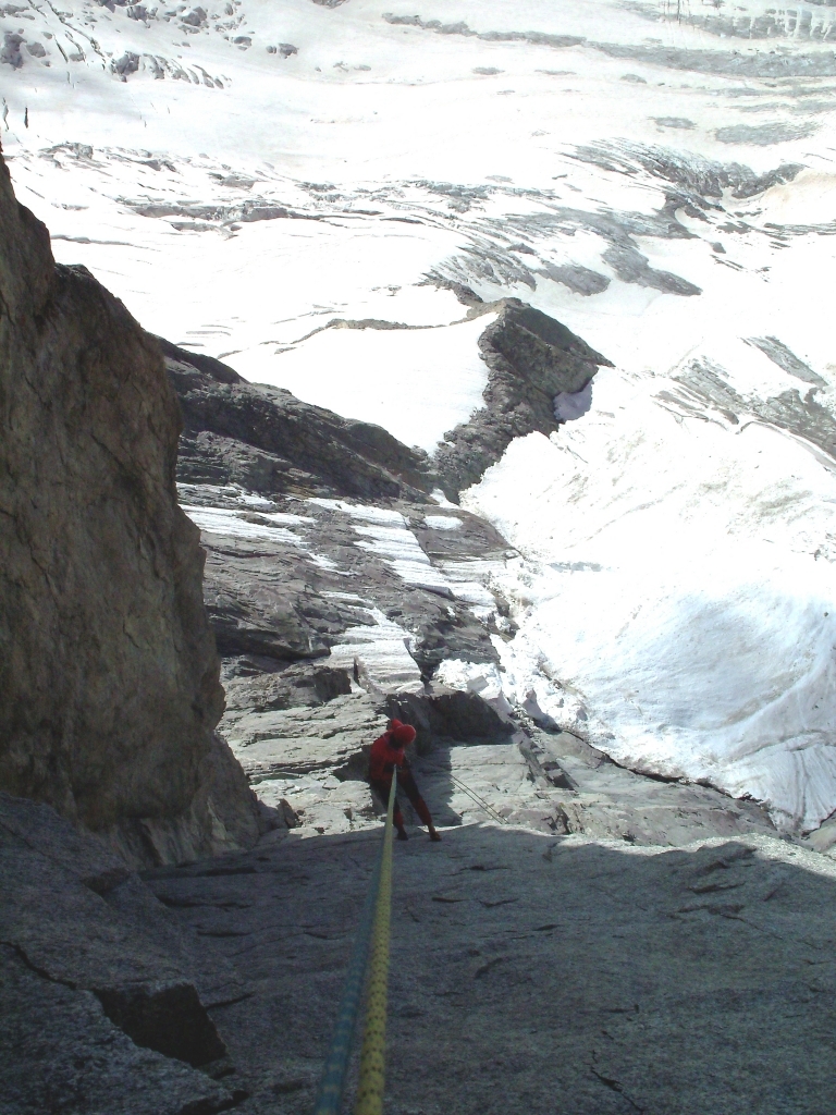 Nu prea reusesc sa adorm si la 2 :30 cand suna ceasul, as mai tot ramane macar cateva minute in sac. Mancam, ne echipam rapid si o dam la vale, pe urma la deal. Sunt uimita cat de cald e. Mie, care imi e tot timpul frig, mi-e foarte cald ! Coboram scarile de la refugiu, recuperam pioletii si coltarii lasati cu o seara inainte la baza scarii si ne oprim pe morena pentru a ascunde o parte echipament ce nu vom lua cu noi. Deviza noastra : light and fast. Noi am crezut ca suntem light si chiar si fast, pana i-am vazut pe francezi, clar mai inaintati in varsta, trecand rapid pe langa noi rapid cu doi rucsacei mici mici. Ne tinem si noi dupa ei pe morena, apoi prin zapada, facand slalom printre crevase, ajungand la baza peretelui odata cu ivitul zorilor. Mihnea pleaca cap si planul e sa mergem coarda intinsa cat se poate. Imi vine randul sa plec si intru entuziasmata in traseu. Insa entuziasmul imi piere destul de rapid, inca dupa prima lungime. Mainile imi sunt inghetate si nu reusesc sa simt deloc stanca. Incep sa ma tarai prin toate fisurile si ceva nu mi-e clar : asta e gradul 5 ? Sunt eu chiar asa de varza ?? Probabil… Insa Mihnea ma asigura, explicandu-mi ca gradul 5 in marii pereti nu-i acelasi cu gradul 5 de la faleza. Stiam asta, dar totusi…