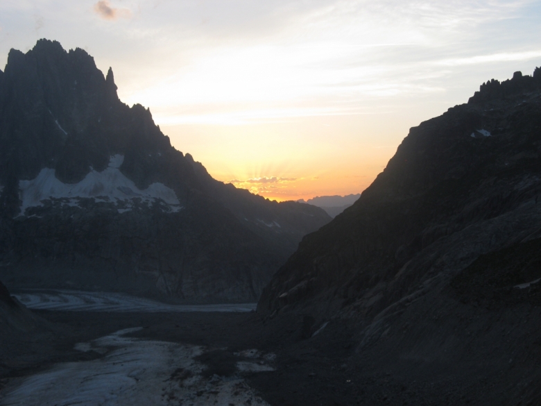 Mancam ceva de seara, ne pregatim rucsacii si stam cu ceilalti la o poveste sa admiram apusul de soare inainte de a ne baga in pat. Inteleg de ce-i place lui Mihnea asa de mult refugiul asta, privelistea care o ofera amplasarea lui inspre Mer de Glace pe de-o parte, iar Grandes Jorasses pe cealalta e superba.