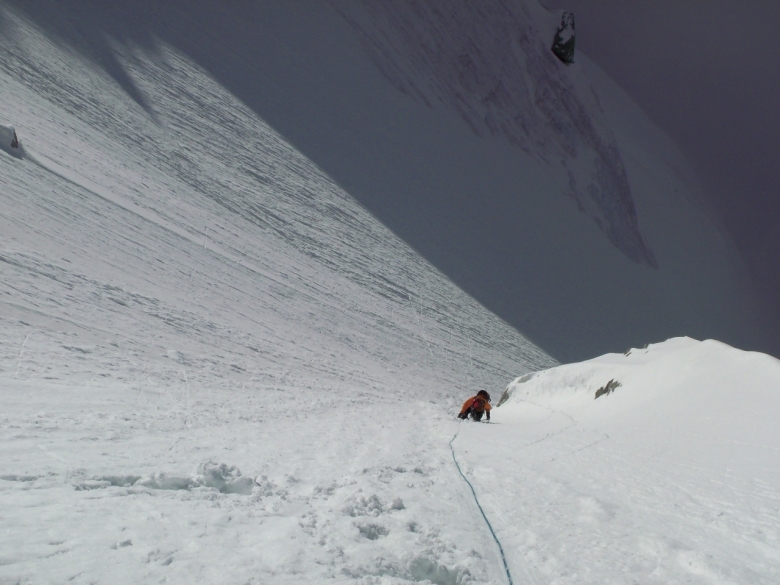 La mijlocul traseului am hotarat sa abandonam culoarul si sa urcam peretele mixt din dreapta – Varianta diagonala D, 4a, 150m, 70º, sperand ca ne va permite sa avansam mai rapid. Ruta intersecteaza dupa 150 m traseul initial. Reintrand in pantele deasupra culoarului ne-am felicitat de decizia luata, culoarul si fata din stanga noastra fiind maturate de o avalansa.