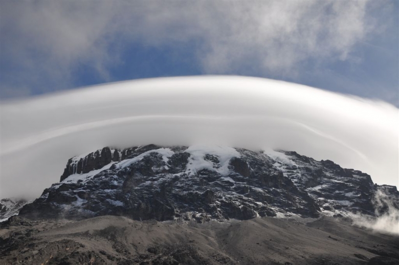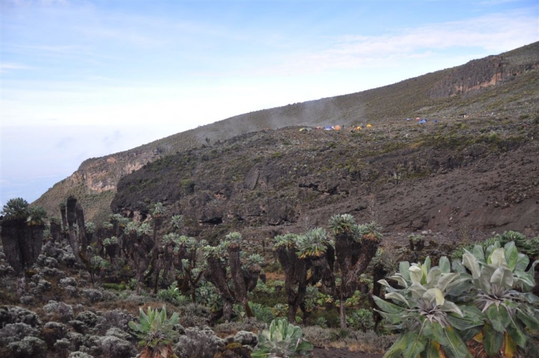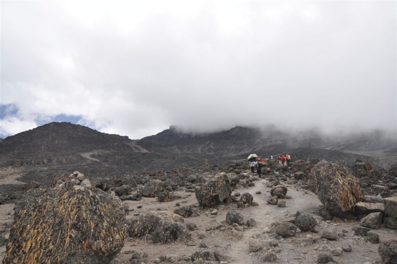 A doua zi: dupa micul dejun consistent (oua, carnati, porridge) plecam urmand o creasta secundara spre Shira Hut. Peisajul se schimba complet, o imbinare ciudata de stinca si arbusti si o multime de lume . Dupa vreo 4 ore ajungem in Shira Camp 3840m unde ne bucuram imaginea muntelui dupa ce ceata s-a risipit. Seara e destul de frig undeva la limita inghetului si suntem incintati ca nu am carat sacii de puf degeaba.