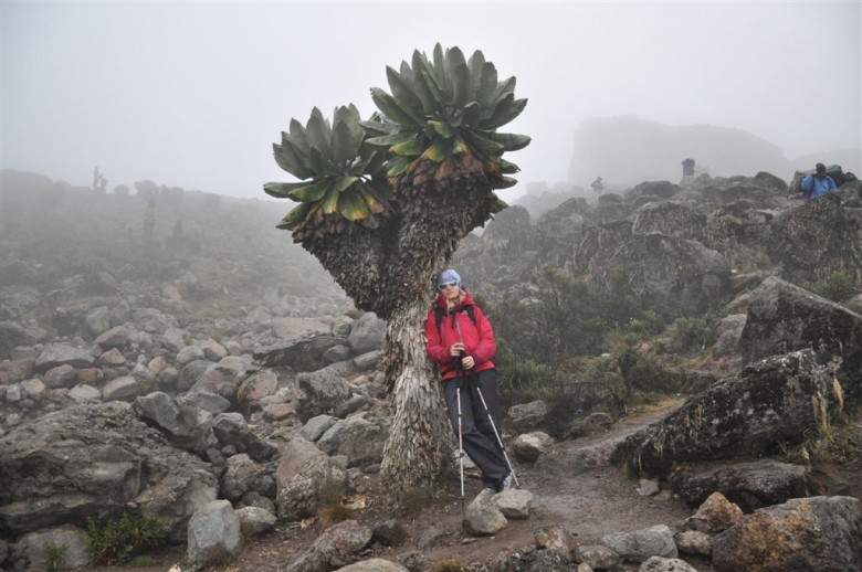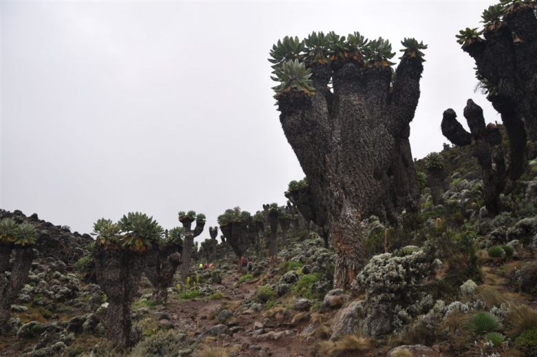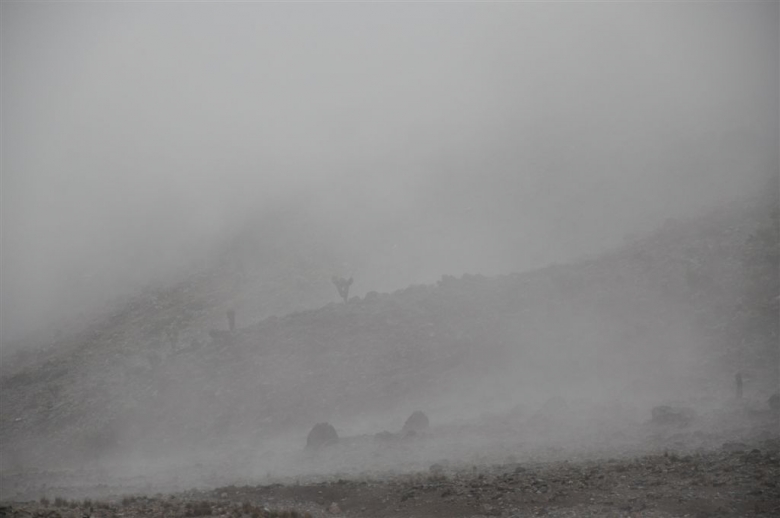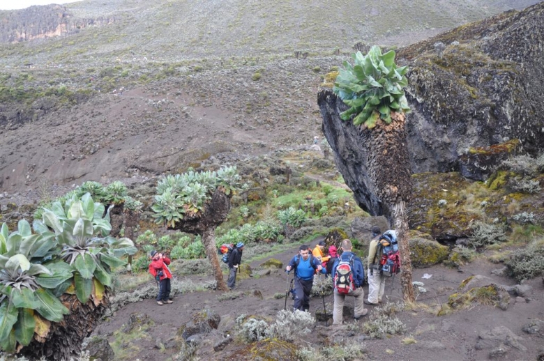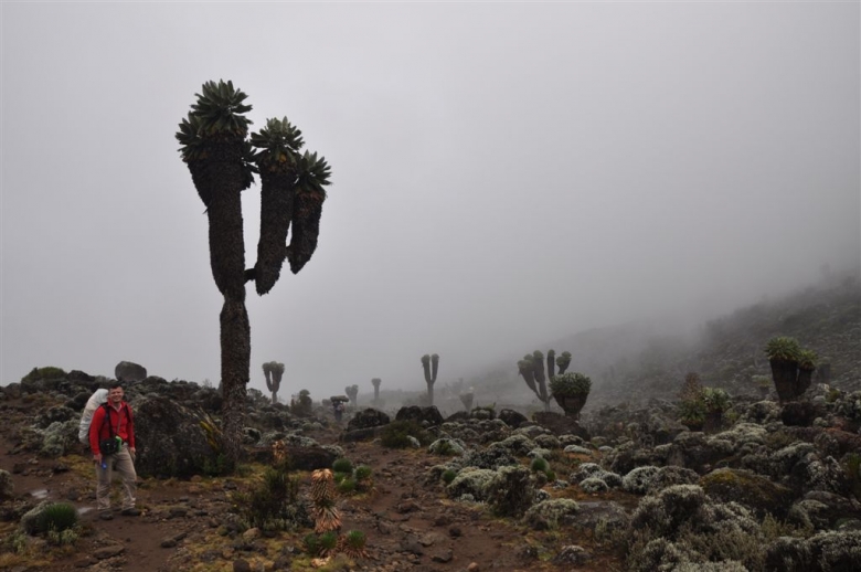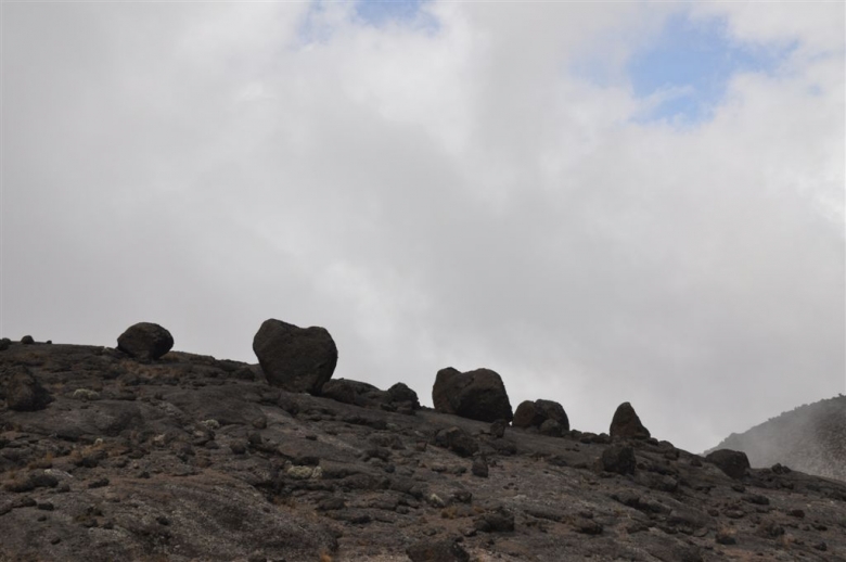 A treia zi : incepem urcarea de pe Platoul Shira pe directie S-E spre Lava Tower 4630 m peisajul fiind de dreptul selenar un fel de semidesert cu nisip vulcanic si pietre unele numai bune de catarat. Chiar cind ajungem in punctual de maxim incepe o ploaie inghetata care ne sileste sa ne luam prinzul chiar sub bolovanii din pas. Coborim apoi pe valea Barranco pina la cota de 3860m peisajul fiind parca desprins din romanele de SF. Niste arbusti care traiesc citeva sute de ani sunt cei care ne fac sa ne fac sa ne simtim ciudat intr-o lume coplect noua.