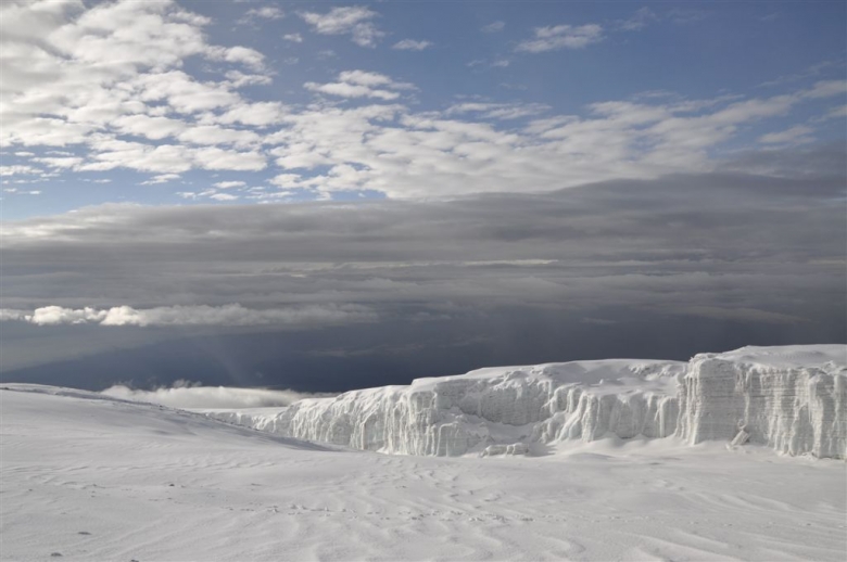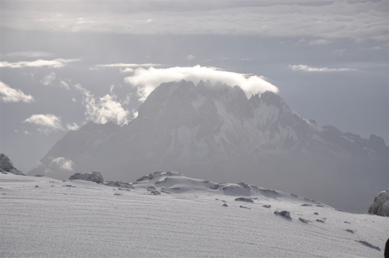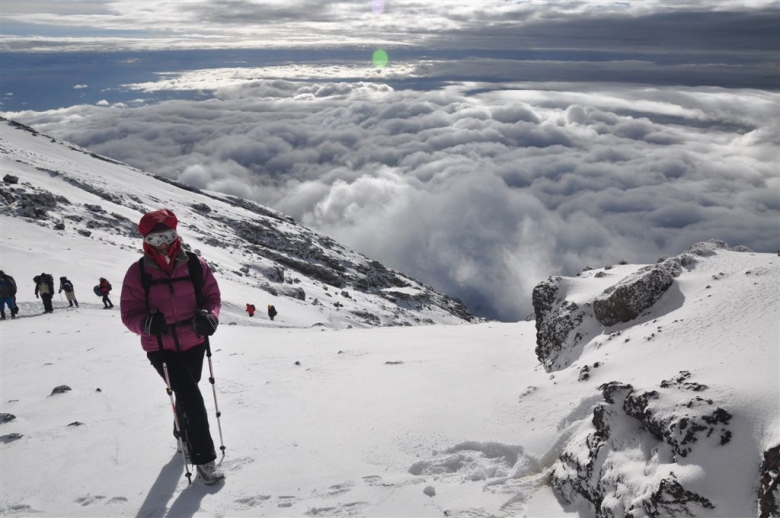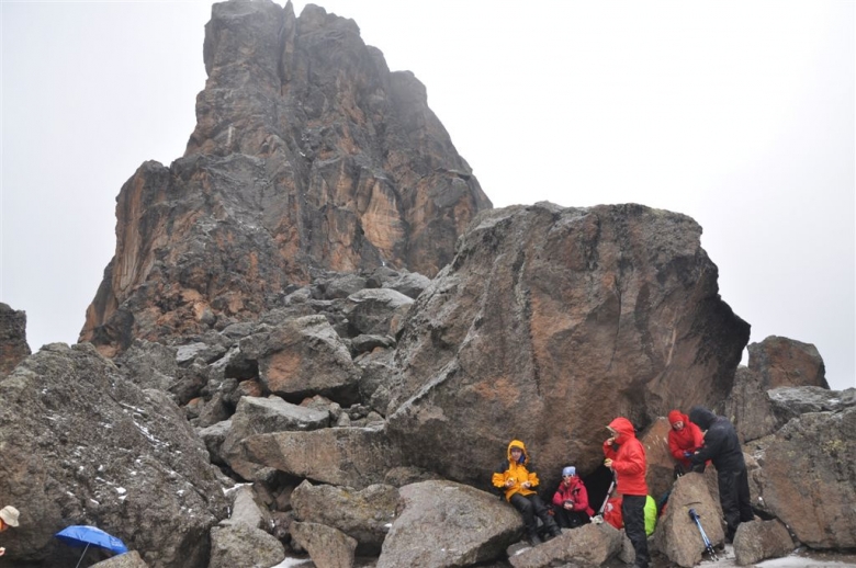 Vremea foarte calduroasa ma pune cel putin pe mine pe ginduri. Ne oprim la prinz ca doar romani suntem si o lenevim pina pe la 2 dupamasa. Cu insistente reusesc sa-i conving pe Eugen si Xena sa mergem mai departe la Barafu Hut 4600m unde urma sa ne odihnim un pic inainte de a urca varful. Si bine facem ca nici bine nu ajungem in tabara ca se porneste furtuna de zapada cu trasnete cu tot. Gasesc un cort liber si ma adapostesc cu Xena luand pe noi toate hainele care le aveam.De data asta chiar am ajuns inaintea porterilor. Dupa 2 ore zapada ajunge cam la 20 cm iar peisajul este acum unul de iarna in toata regula. Ajung si bagajele noastre cu porteri speriati, inghetati si echipati “vai de mama lor”. Nici noi nu avem moralul prea ridicat cu asemenea vreme mai ales in ziua varfului.Asta e si sa nu uitam de ce am venit aici. Plecam la 12 noaptea pe o noapte fara stele dar cel putin ninsoarea s-a oprit. Orbecaim prin ceata pe un traseu complect necunoscut si intr-un ritm mult prea incet si pentru gustul lui Xena. Nu prea avem ce face ne tinem de ghizi care cel putin par sa recunoasca traseul. Incepe sa se lumineze chiar cind ajungem in locul numit Stela Point 5700m. De aici o luam incet pe o creasta in sus si undeva pe la la ora 7 ajungem pe varful UHURU 5895 m. Facem pozele de rigoare , mai asteptam si pe ceilati pentru poza de grup,apoi incepem coborirea intr-un ritm dea dreptul somnambulic. Ajungem in tabara de la 4600m eu dupa 3 ore ( Xena mult mai repede circa 1,5 h) si nu stiu cum sa ma bag mai repede in sacul de dormit pentru a beneficia de cit mai mult somn posibil. In jurul prizului stringem tabara si coborim pina la 3800 m in Mweka Camp. Urcarea ca urcarea dar coborirea de 2800m ne-a terminat mai ales in conditiile in care ai dormit mai mult in picioare.