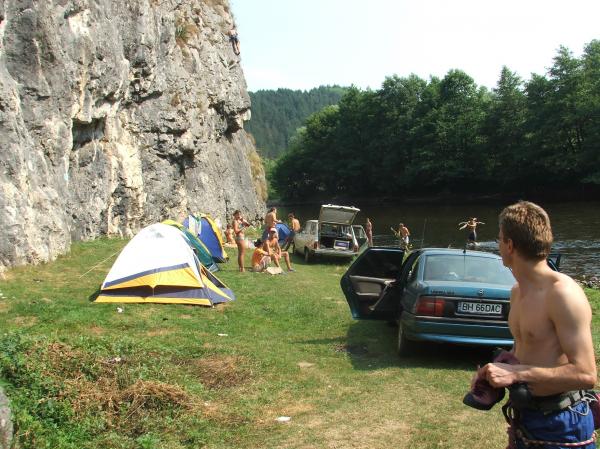 Pe la 17:00 ne hotaram sa plecam la sosea sa mancam la un local de pe marginea drumului si inainte sa plecam facem toti o baie pe cinste in Cris , si ne jucam cu un frisbee. Mancam pe saturate , la preturi rezonabile , si in afara de chelnerita care era cam uituca totul a fost cum nu se putea mai bine.Tot acolo am evitat si ploaia care isi anunta prezenta de ceva vreme. Cand ne intoarcem la suncuius la faleza , avem surpriza sa vedem Crisul crescut cu vreo 30 cm si apa neagra si murdara si , ne felicitam pentru baia facuta inainte sa plecam la masa. Majoritatea nu prea mai au chef de catarat , desi acum temperatura e mult mai buna. Eu as vrea sa incerc un traseu , Flyer[7+/8-] , si Cosmin zice ca se baga si el, Marcus si el si Jeni , nu foarte convins isi trage din nou hamul pe el. Incerc eu si nu-mi iese pasul , asa ca ma dua jos sa ma odihnesc un pic, Jeni inceraca si aceeashi poveste. Cosmin isi pune leucoplast pe degete, si zice ca inecarca el da sa mai incerc eu o data ... asa ca , ma vad obligat sa mai fac o tentativa. Imi iese traseul, si ajuns jos dau jos si hamul si im deschid o bere alaturi de Jeni si de restu, si il urmarim pe Cosmin cum da si el traseul, flash. Marcus il catara si el , dar in mansa, si pentru ca nu s-au saturat , Cosmin si Marcus , mai catara un traseu mai usor mai in stanga. Dupa inca nishte manele, pe care de data asta le-am ascultat stereo, impreuna cu Rage Against The Machine de la noi, spre disperarea lor :D ne dam seama ca noaptea asta nu mai putem dormi acolo , daca vrem sa dormim si ne hotaram sa cautam tabara cercetasilor si sa ne alaturam ... dar dupa indelungi cautari prin preajma Suncuiusului nu o gasim si ne punem baza intr-o poiana unde suntem doar noi ... si liniile de tren, la o distanta cat de cat acceptabila.